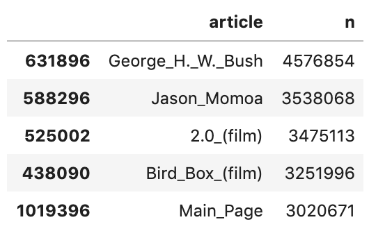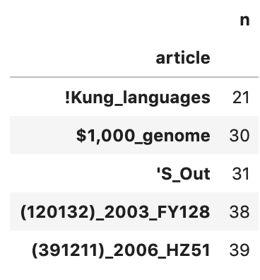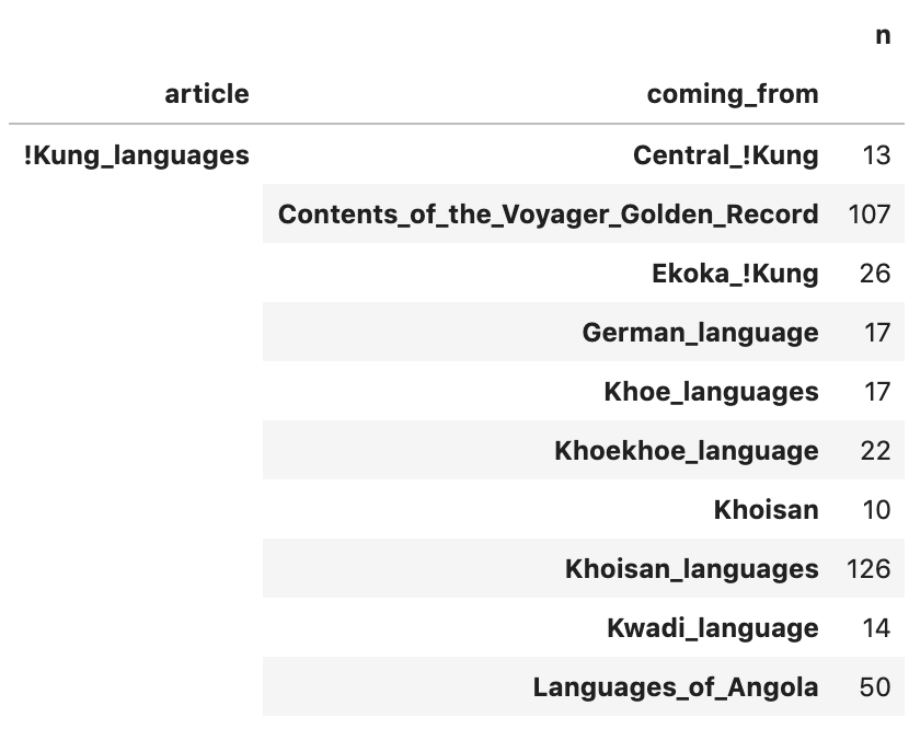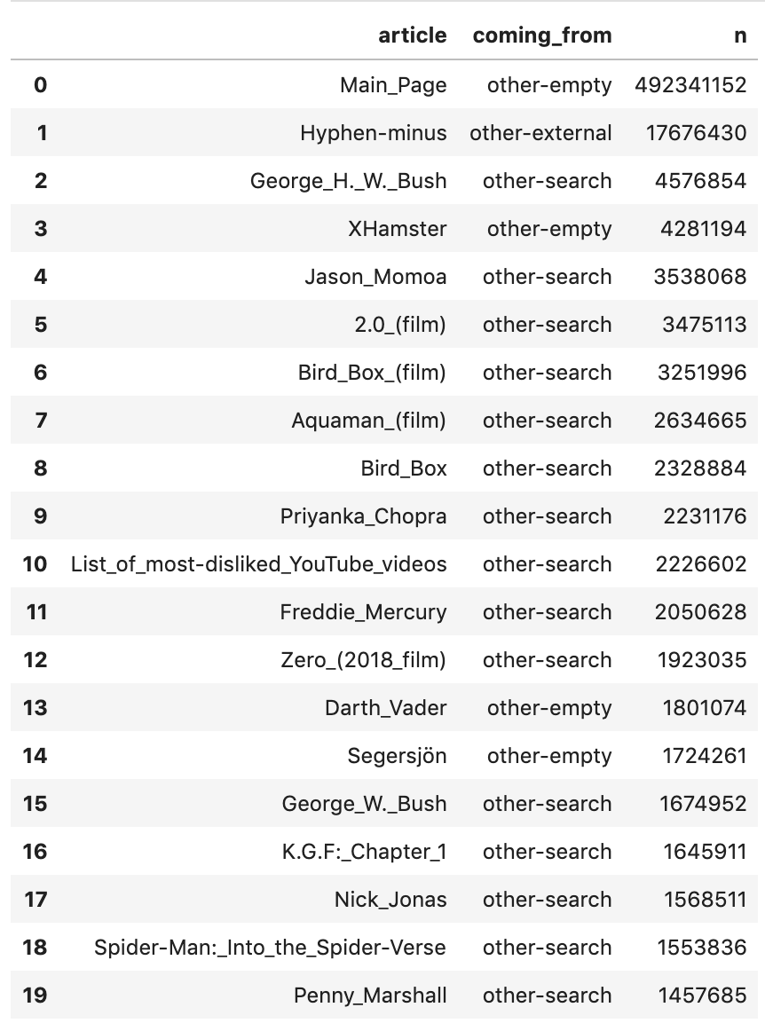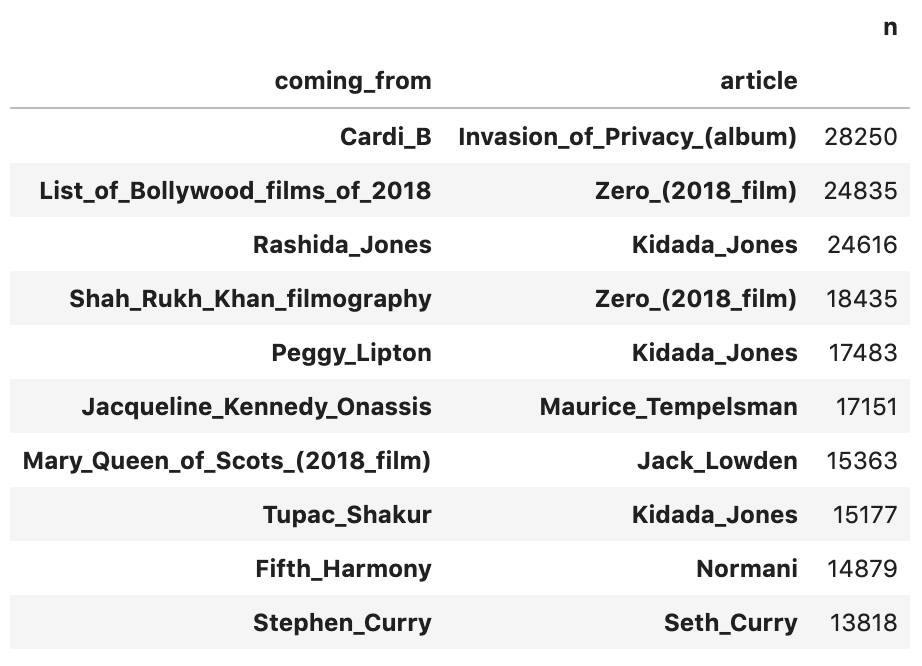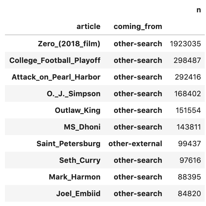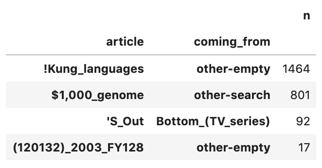 pd.DataFrame(q, columns=['article', 'coming_from', 'n']).head(20) And voila, our table is ready.